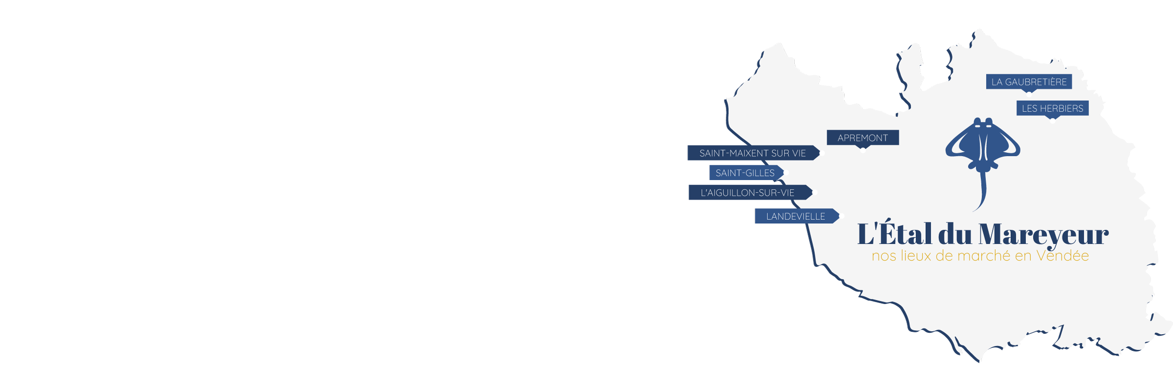 L’ Étal du Mareyeur est artisan poissonnier depuis 2012 en Vendée. Nous sommes présents sur les marchés de Vendée, tous les jours de la semaines, sur 7 sites de vente. Notre objectif est de vous apporter chaque jour, le meilleur des poissons issus d’une pêche locale en direct du port de Saint Gilles Croix de Vie, des Sables d’Olonnes et avec la criée de Lorient.